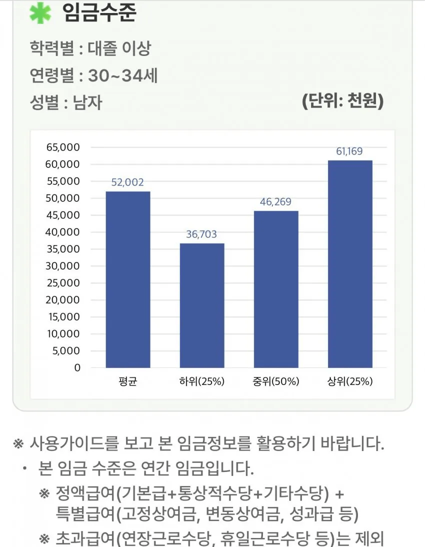 30대 초반 남자 진짜 리얼 연봉 통계.txt 으냥냥 0 25 0 0 01.19 06:24 주소복사 복사되었습니다! 30대 초반 대졸남 평균 5200만원 중위값 (상위 50%) 4626만원 상위 25% 6116만원 하위 25% 3670만원 0 0