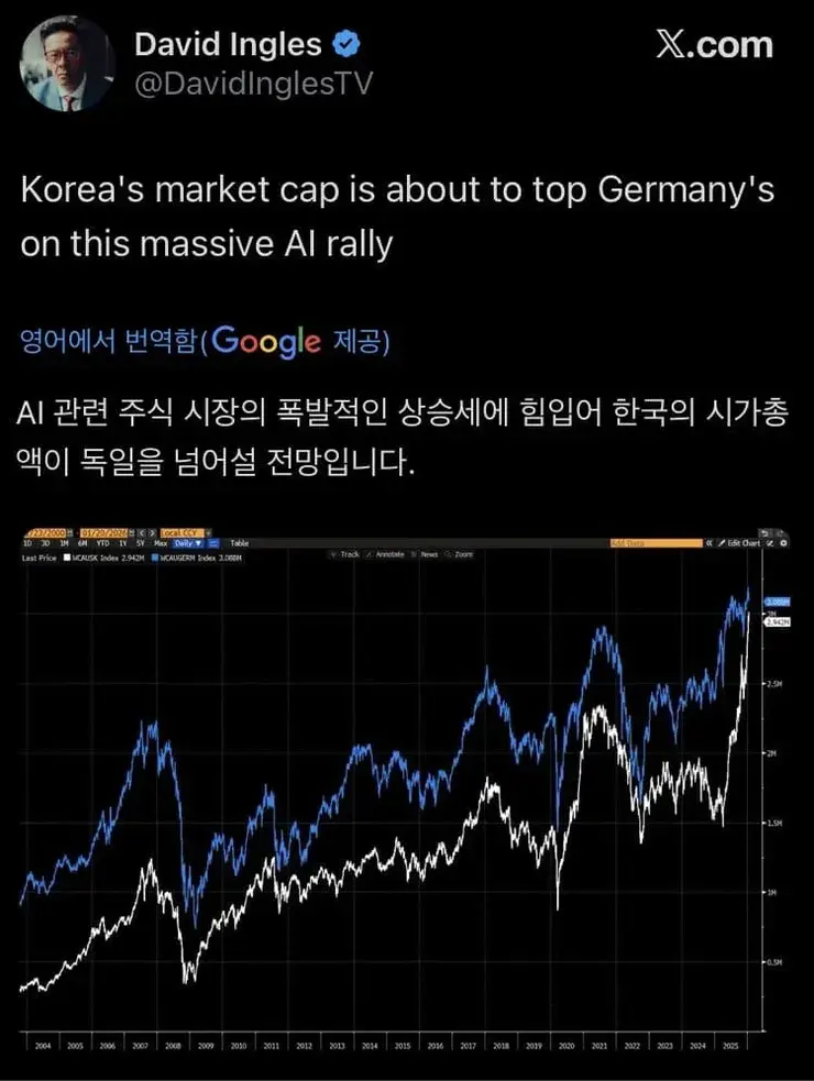 한국 기업 시가 총액이 독일 추월 직전