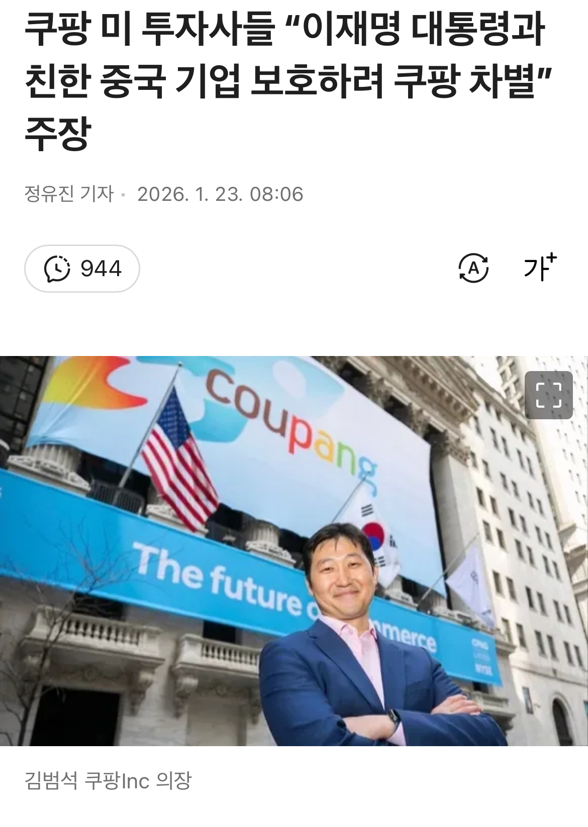 쿠팡 미 투자사들 “이재명 대통령, 중국 기업 보호하려 쿠팡 차별” 주장 미래수사관 0 0 0 0 01.24 11:14 주소복사 복사되었습니다! https://v.daum.net/v/20260123080644576 0 0