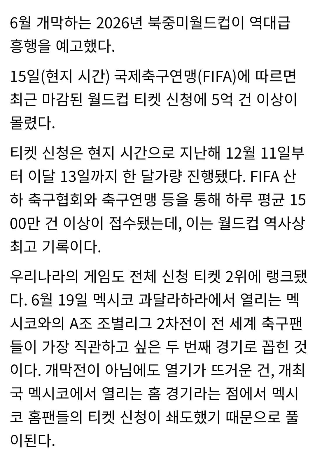 월드컵 티켓 신청 5억 건… 한국·멕시코전 ‘인기 2위’