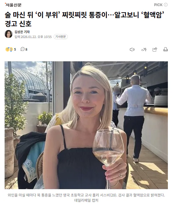 https://n.news.naver.com/article/081/000361101620대 여성이 와인을 마실 때마다 느낀 목 통증이 혈액암의 경고 신호였던 것으로 드러났다. 의료진조차 초반엔 단순 호르몬 변화로 판단했지만, 결국 혈액암의 일종인 호지킨 림프종 진단이 나왔다.